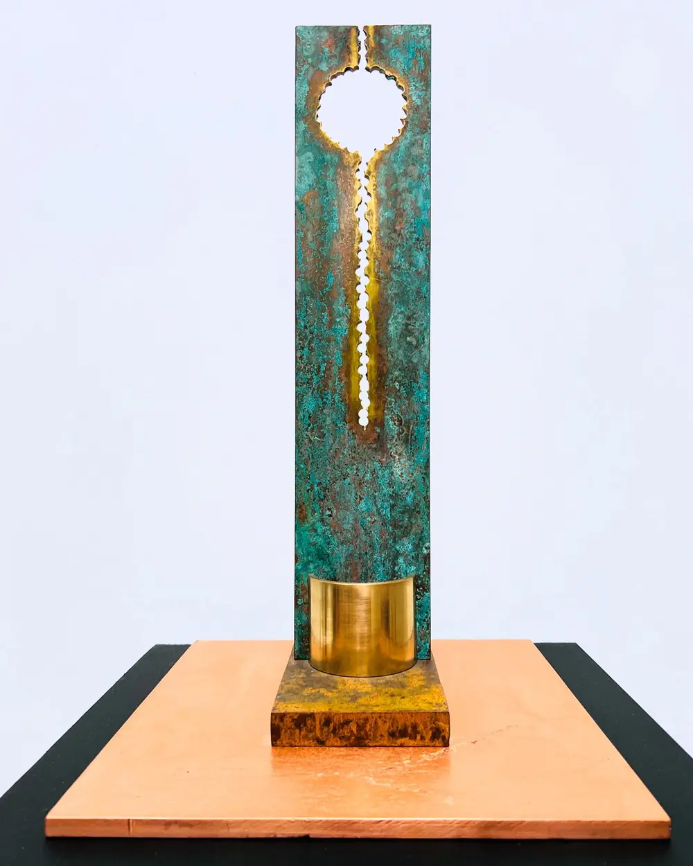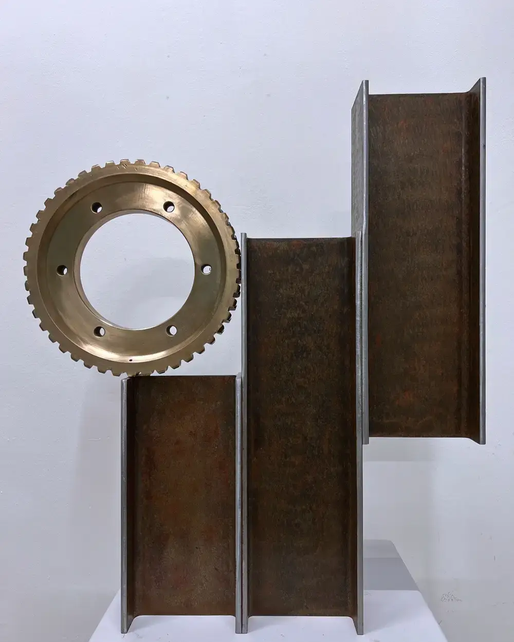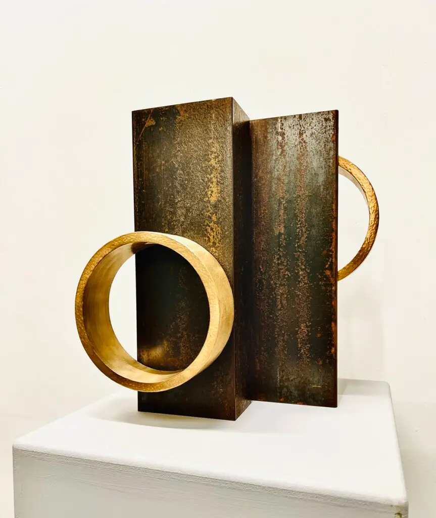 I am a sculptor based in Bristol and I create abstract sculptural forms that consider space, shape and texture. I have often worked using industrial type materials, taking those materials away from their initial function and creating a new place for them to exist in. I like to make work that is simplistic in one sense but that may hold something much more complex when viewed closely or for an extended period of time. Recently I have been self patinating metal that I will bring to new work next year.  I have exhibited at the Bath Society of Artists Annual Open Exhibition and I am a member of The Power of 10 artists group, a collective which meets and exhibits in Bristol.